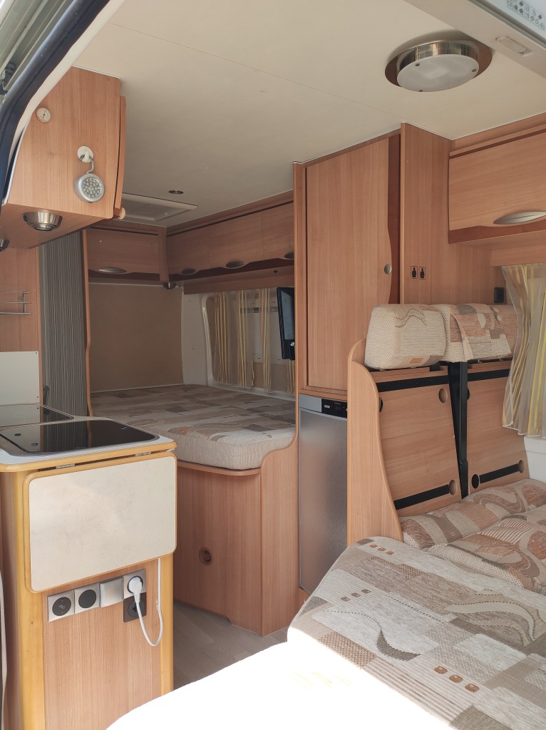 Conçu d’usine pour 4 personnes, sur une base de Fiat Ducato, il possède 2 lits de 120 cm, une TV dans l’espace nuit, une kitchenette, une SDE, un frigo de 80L (atout non-négligeable quand on est 4), un coin dinette quand le deuxième lit n’est pas installé ainsi qu’une grande soute et son porte-vélo ! Bien sûr nous avons gaz, électricité, eau même en autonomie (non raccordé).